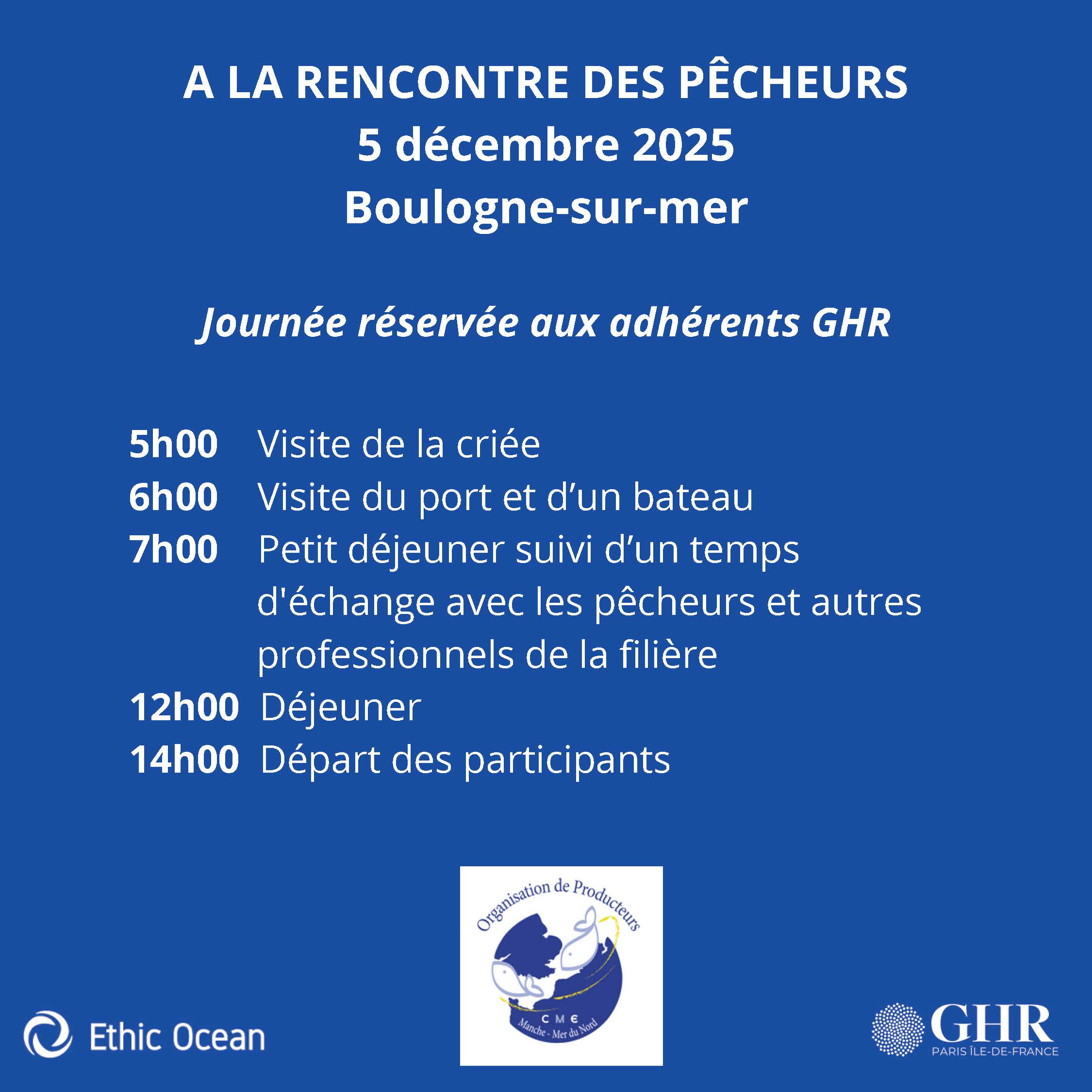 Comme l’année dernière, le GHR Paris Île-de-France, en partenariat avec Ethic Ocean, vous invite à une journée exceptionnelle « À la rencontre des pêcheurs », le vendredi 5 décembre prochain à Boulogne-sur-Mer.
