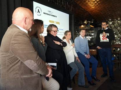 Photo 1 (G à D) : Gino Andreetta, ,Caroline Denat, Noémie Nussbaumer, Marion Vernay, Vincent Jay, Alexis Sbriglio, animateur-journaliste.