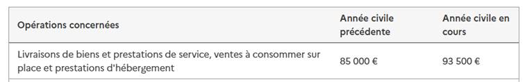 | Livraisons de biens et prestations de service, ventes à consommer sur place et prestations d’hébergement | 85 000 € | 93 500 € |